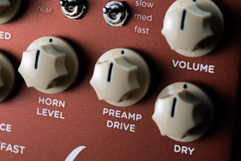 Lex’s Preamp Drive knob lets you control the drive of the rotary cabinet’s tube preamp and phase inverter stages.