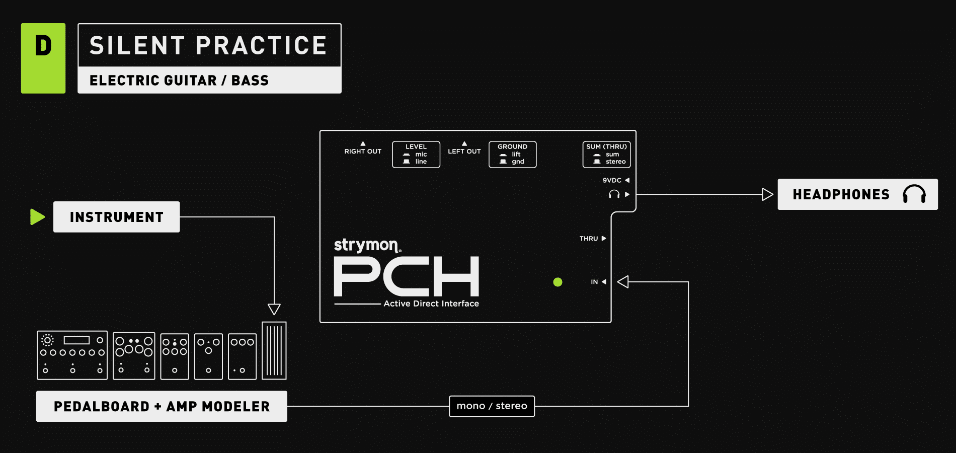 PCH has a powerful headphone amplifier onboard, making it easy to monitor or practice listening to the sound of your entire rig or pedalboard in full stereo, no matter the pedal order or the components.