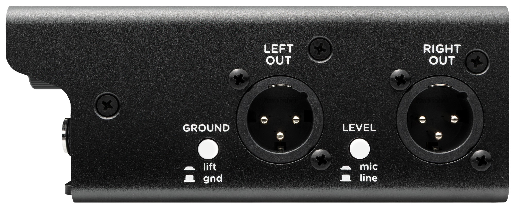 Press to the “in” position for mic level XLR output. Set to the “out” position for line level XLR output.